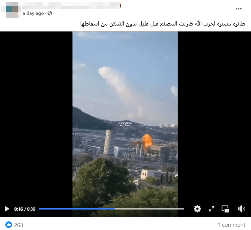 في أعقاب ذلك، تناقل ناشطون على منصات التواصل مقطعاً يدّعون أنه لاستهداف مصنع إسرائيلي بطائرة مسيرة أطلقها حزب الله،
