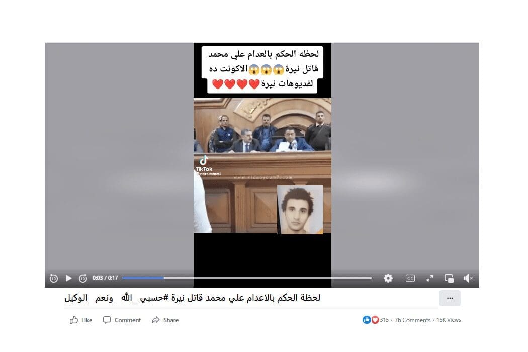 إثر ذلك تداول ناشطون على فيسبوك مقطعًا يزعمون أنه يظهر لحظة النطق بحكم الإعدام بحق قاتل الطالبة نيرة أشرف،