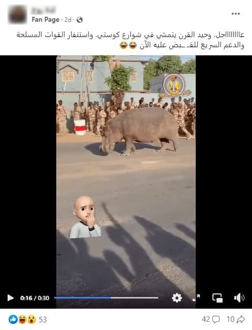 تناقل ناشطون على فيسبوك مقطع فيديو يدّعي ناشروه أنه يظهر وحيد قرن يتجول في شوارع كوستي في السودان.