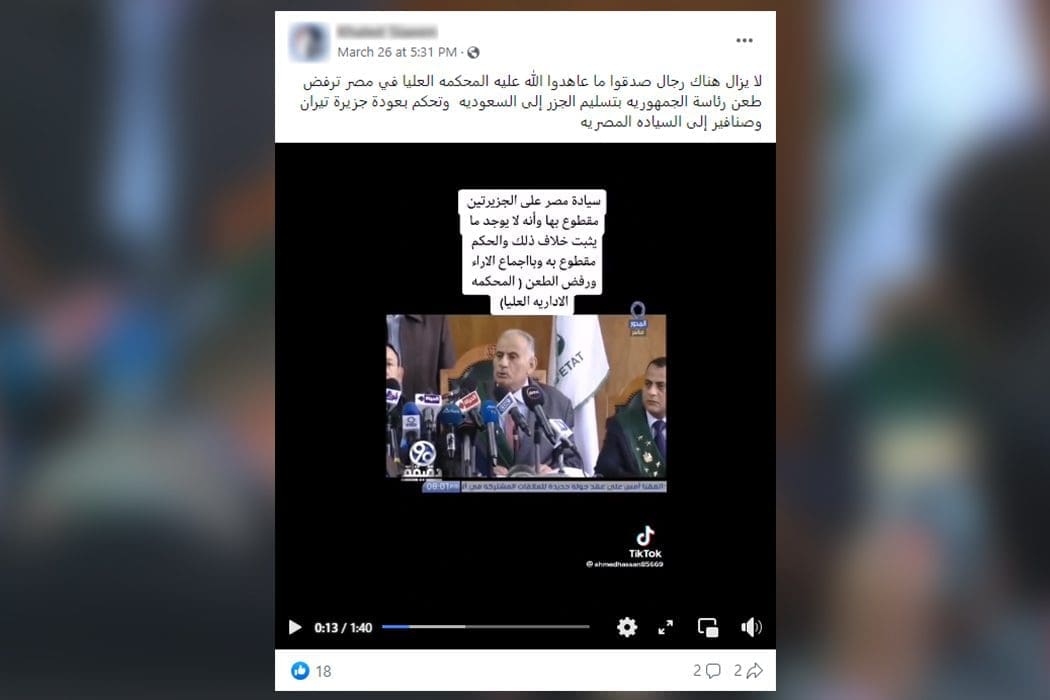 تناقل ناشطون فيسبوك مقطع فيديو يدّعي ناشروه أنه يبين حكم المحكمة العليا في مصر حديثًا بعودة جزيرتي تيران وصنافير إلى السيادة المصرية،