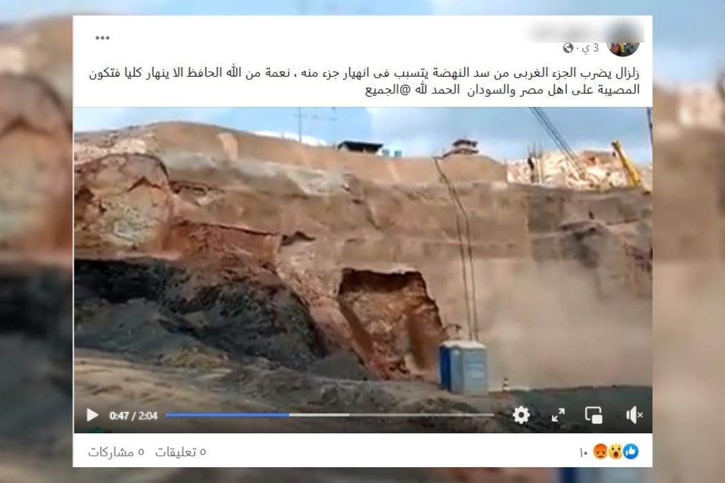 تناقل ناشطون على فيسبوك مقطعًا يدّعون أنه يظهرون انهيار سد النهضة الإثيوبي مؤخرًا، في أعقاب الزلزال الذي شعر به سكان أديس أبابا في 07 مايو 2023،