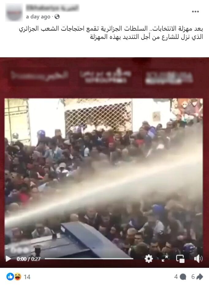 إذ قاد البحث العكسي عن لقطة ثابتة من مقطع الادعاء في محرك البحث جوجل إلى الفيديو ذاته منشورًا عبر حساب محلي جزائري على منصة إكس في 22 فبراير 2020 على أنه يبين استخدام الشرطة الجزائرية المياه لتفريق تظاهرات خرجت آنذاك،