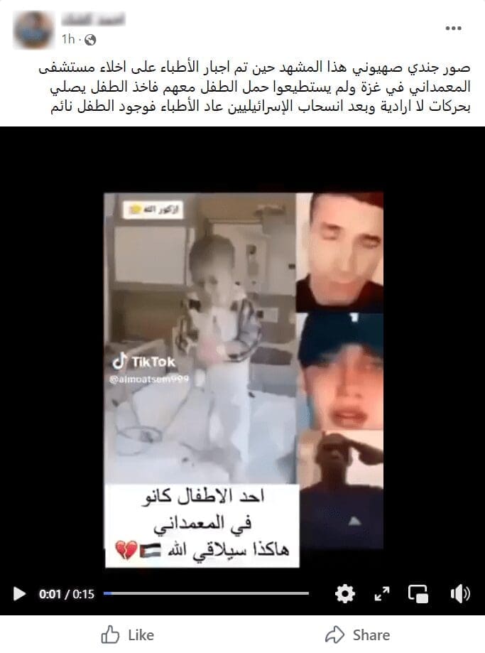 صور جندي صهيوني هذا المشهد حين تم اجبار الأطباء على اخلاء مستشفى المعمداني في غزة ولم يستطيعوا حمل الطفل معهم فاخذ الطفل يصلي بحركات لا ارادية وبعد انسحاب الإسرائيليين عاد الأطباء فوجود الطفل نائم
