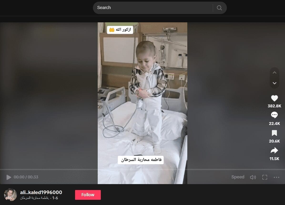 حيث نشر حساب على المنصة المقطع ذاته بمدة أطول بتاريخ 06 يناير 2023، على أنه يظهر فتاة تدعى فاطمة مصابة بالسرطان.