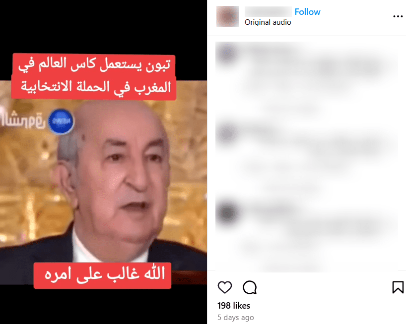في أعقاب ذلك، تناقل ناشطون مقطعاً للرئيس عبد المجيد تبون يدّعون أنه يستخدم إقامة كأس العالم 2030 في المغرب وإسبانيا والبرتغال كترويجٍ لحملته الانتخابية،