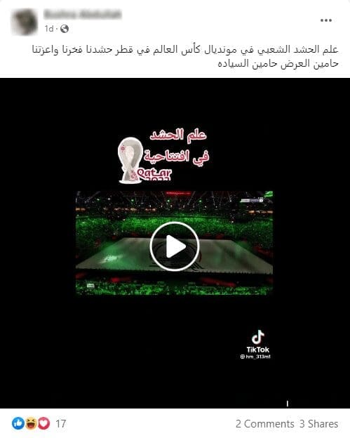 تناقل ناشطون على فيسبوك مقطعًا يدّعي ناشروه أنه يبين ظهور علم الحشد الشعبيّ في افتتاحية مونديال كأس العالم في قطر.