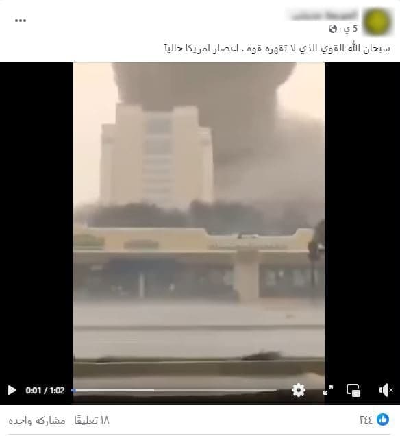علاوة على ذلك؛ نلاحظ أن المقطع الأصلي لا يظهر إعصارًا خلف المبنى كما في مقطع الادعاء،
