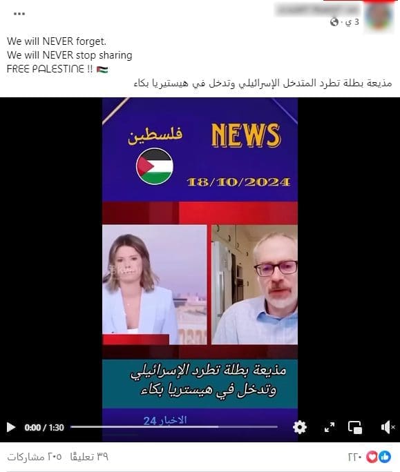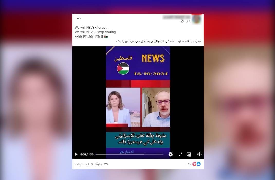 هذا المقطع مركب من مشهدين مختلفين، ولا يظهر قيام المذيعة بطرد ضيفاً إسرائيليًا وصف يحيى السنوار بالمخرب