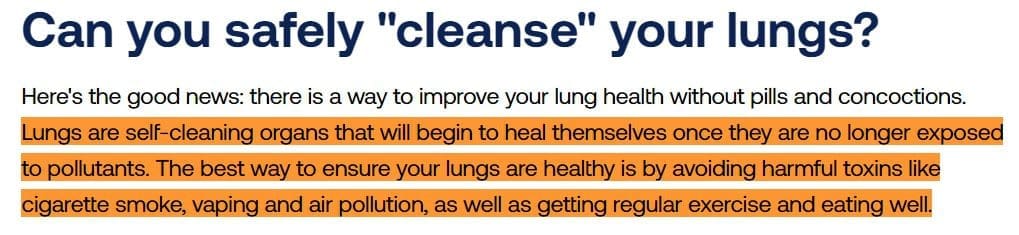 في هذا السياق، تواصل فريق فتبينوا مع جمعية الرئة الأمريكية للاستفسار عن فاعلية هذا المنتج في تنظيف الرئتين والمزاعم الأخرى المذكورة في الادعاء،