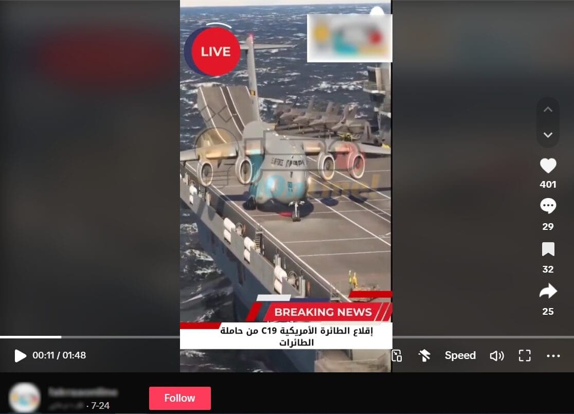 هذا المقطع مقتبس من لعبة محاكاة إلكترونية، ولا يصور مشاهد حقيقية لإقلاع طائرة أمريكية من حاملة طائرات