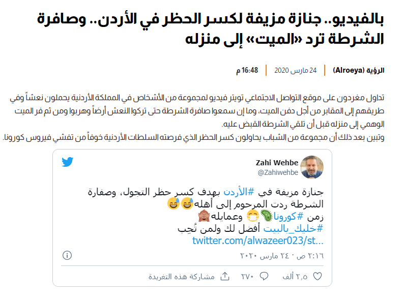وقامت العديد من المواقع هنـا، وهنـا بنشره بتاريخ 23-24-25 مارس 2020 على أنه مقطع فكاهي وغير حقيقي لبعض الشباب يحاولون كسر حظر التجول في الأردن،