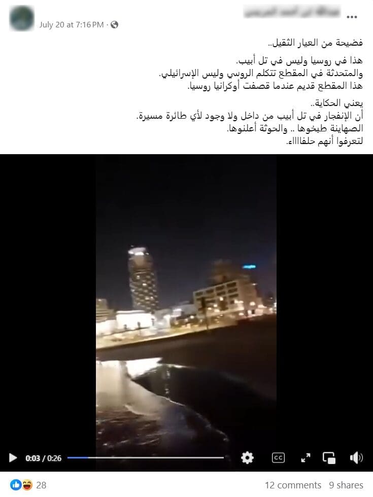بالمثل؛ نشرت العديد من وسائل الإعلام مشاهد المقطع ذاتها على أنها تبين لحظة اصطدام الطائرة المسيرة “يافا” بشقة في تل أبيب،