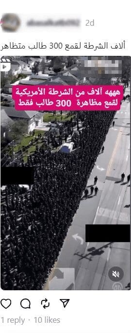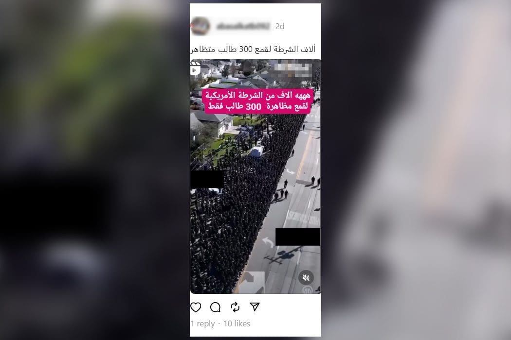 إثر ذلك تداول ناشطون على مواقع التواصل مقطع فيديو يدعون أنه يظهر احتشاد الآلاف من عناصر الشرطة الأميركية لمواجهة الاحتجاجات الطلابية السلمية،