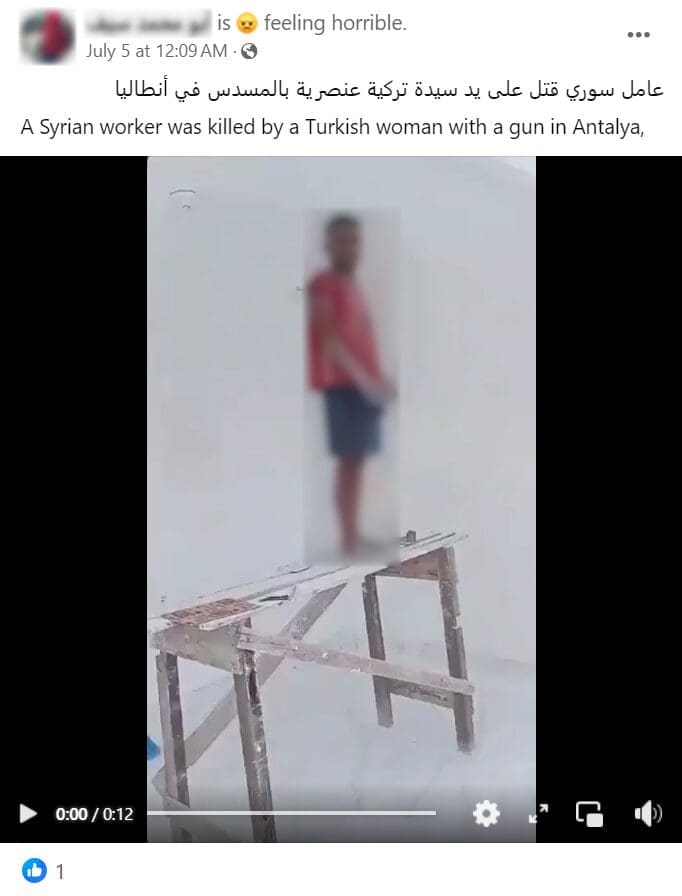 إثر ذلك تداول ناشطون على فيسبوك مقطع فيديو يدعون أنه يظهر قيام سيدة تركية بقتل شاب سوري في أنطاليا،