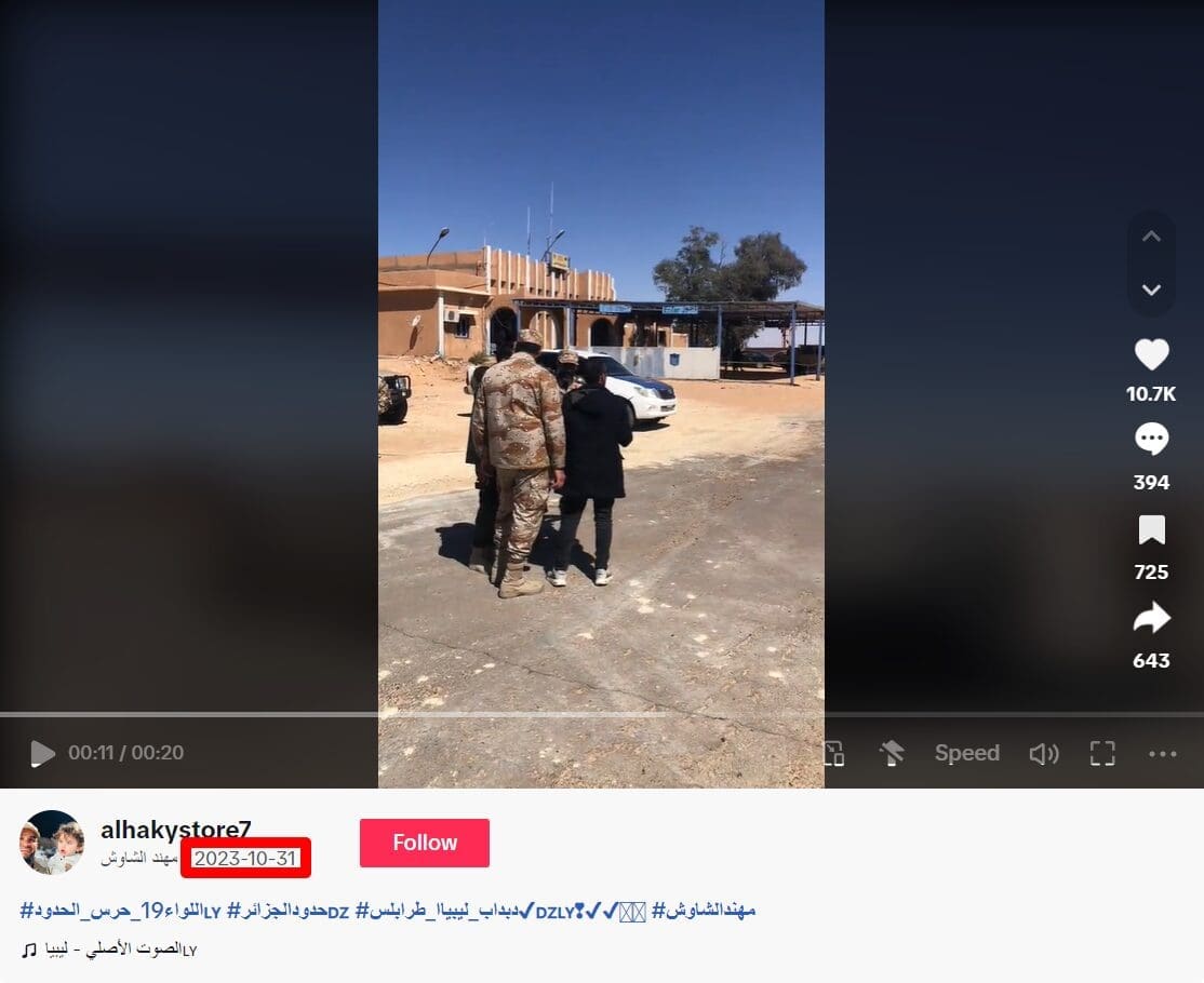 إذ نشر حساب على المنصة المقطع ذاته بتاريخ 31 أكتوبر 2023، على أنه يبين اللواء 19 من حرس الحدود الليبي في معبر الدبداب على الحدود الليبية الجزائرية،