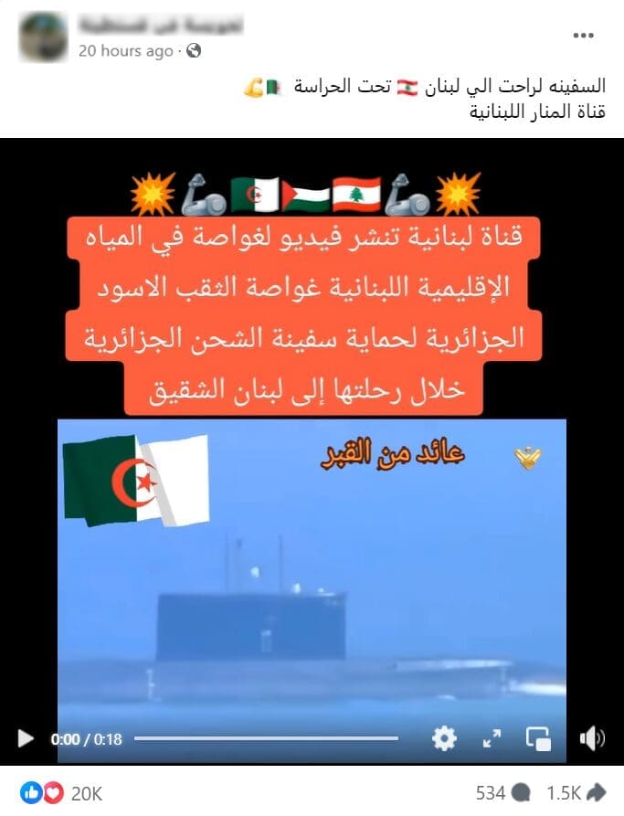 هذا المقطع يعود لاستعراض عسكري عام 2022 في ذكرى استقلال الجزائر، ولا يظهر غواصة لحماية سفينة وقود مرسلة إلى لبنان مؤخرًا