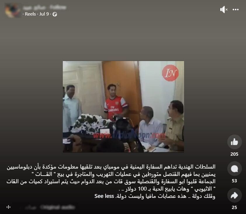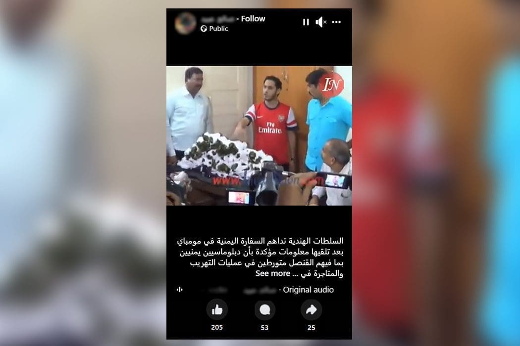 هذا المقطع متداول منذ عام 2013 لضبط شرطة حيدر أباد  يمنيين بتهمة تجارة القات في الهند آنذاك، ولا يبين ضبط كميات من القات في السفارة اليمنية في الهند