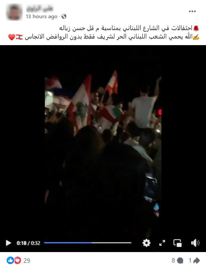 إثر ذلك تداول ناشطون على الفيسبوك مقطع فيديو يدعون أنه يظهر احتفالات في الشارع اللبناني إثر مقتل الامين العام لحزب الله،