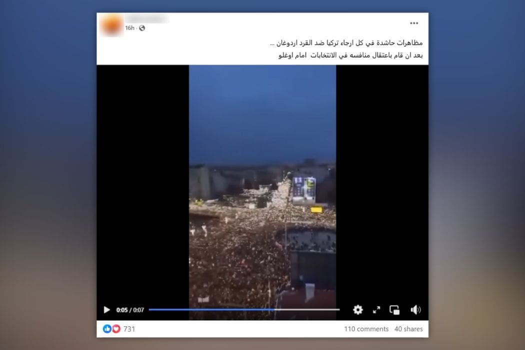 بحسب فرانس 24 –دون تصرف-: «اعتقلت الشرطة التركية الأربعاء أكرم إمام أوغلو، رئيس بلدية إسطنبول، الذي يعد من أبرز المنافسين السياسيين للرئيس التركي رجب طيب أردوغان. وقال أحد مساعديه في تغريدة على إكس إن رئيس بلدية إسطنبول “قيد الاحتجاز في مقر الشرطة التركية بعدما تمت مداهمة منزله”.»، في هذا السياق تداول ناشطون على فيسبوك مقطع فيديو يدعون أنه يصور مظاهرات حاشدة ضد الرئيس التركي أردوغان.