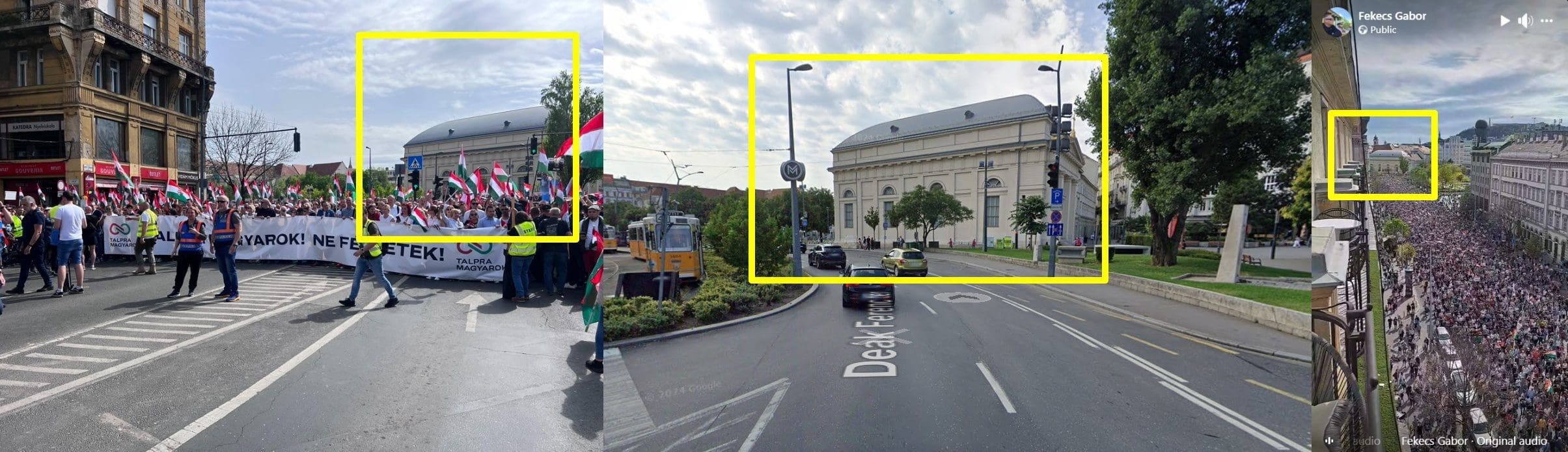 فيما يمكن مقارنة معالم مبنى يظهر في المقطع مع الصور التي توفرها خرائط جوجل في إحدى شوارع العاصمة المجريّة بودابست، وصورة من المظاهرة آنذاك،