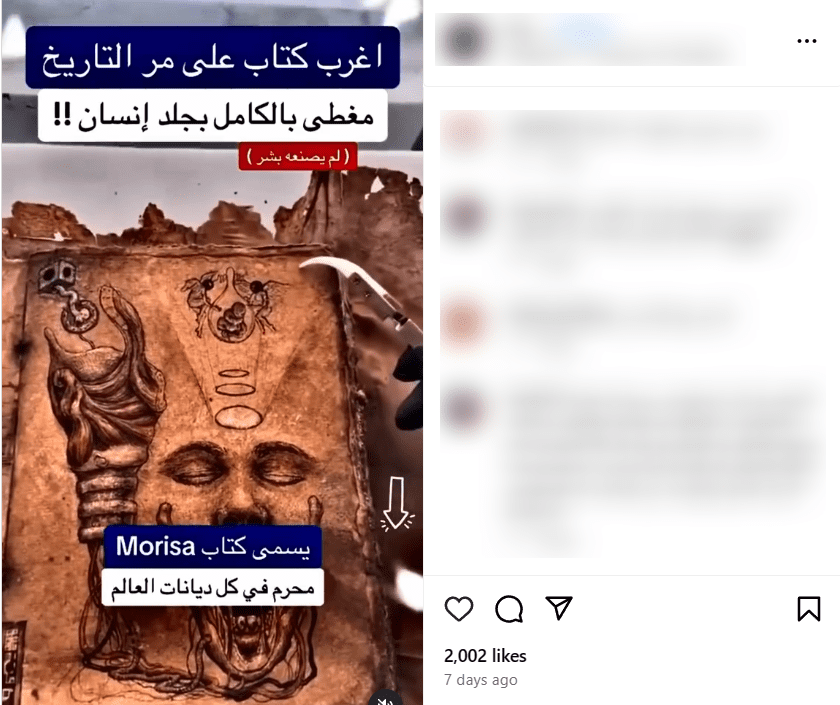 هذا المقطع يظهر عملاً فنياً وليس كتابًا باسم “Morisa” غلافه مصنوع من جلد إنسان