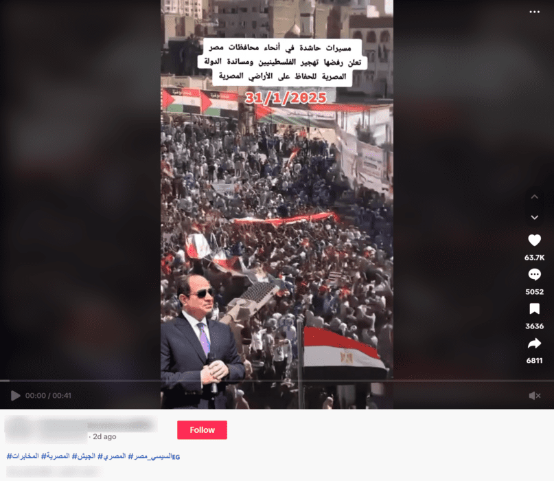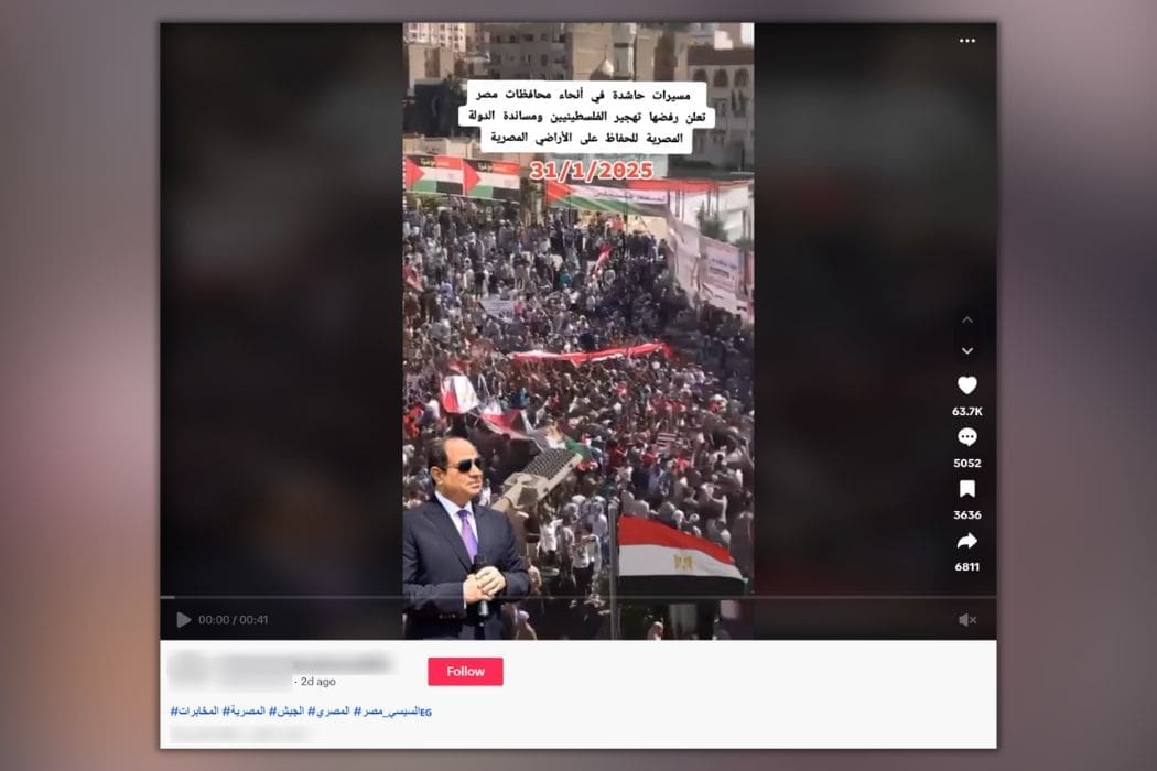 بحسب فرانس24 ضمن تقريرً نشرته بتاريخ 31 يناير 2025 جاء فيه –دون تصرف-: “رفضًا لخطة الرئيس الأمريكي دونالد ترامب لنقل فلسطينيين من قطاع غزة إلى مصر والأردن، شهدت الحدود المصرية مع غزة، الجمعة، احتجاجات غير نادرة. ورفع المشاركون الأعلام المصرية والفلسطينية بالقرب من معبر رفح.”، إثر ذلك تداول ناشطون على تيكتوك مقطع فيديو يدّعون أنه يصور جانبًا من تلك الاحتجاجات.