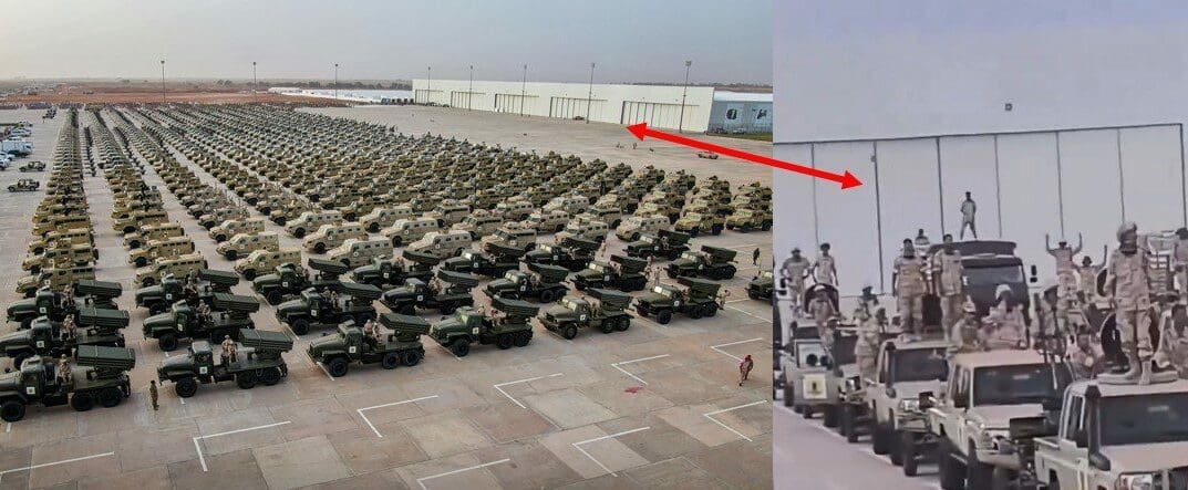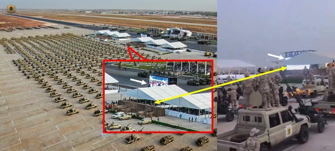 مطابقة لقطات من مقطع الادعاء (يمين) مع صور الاستعراض العسكري في مطار بنينا الدولي في ليبيا (يسار)