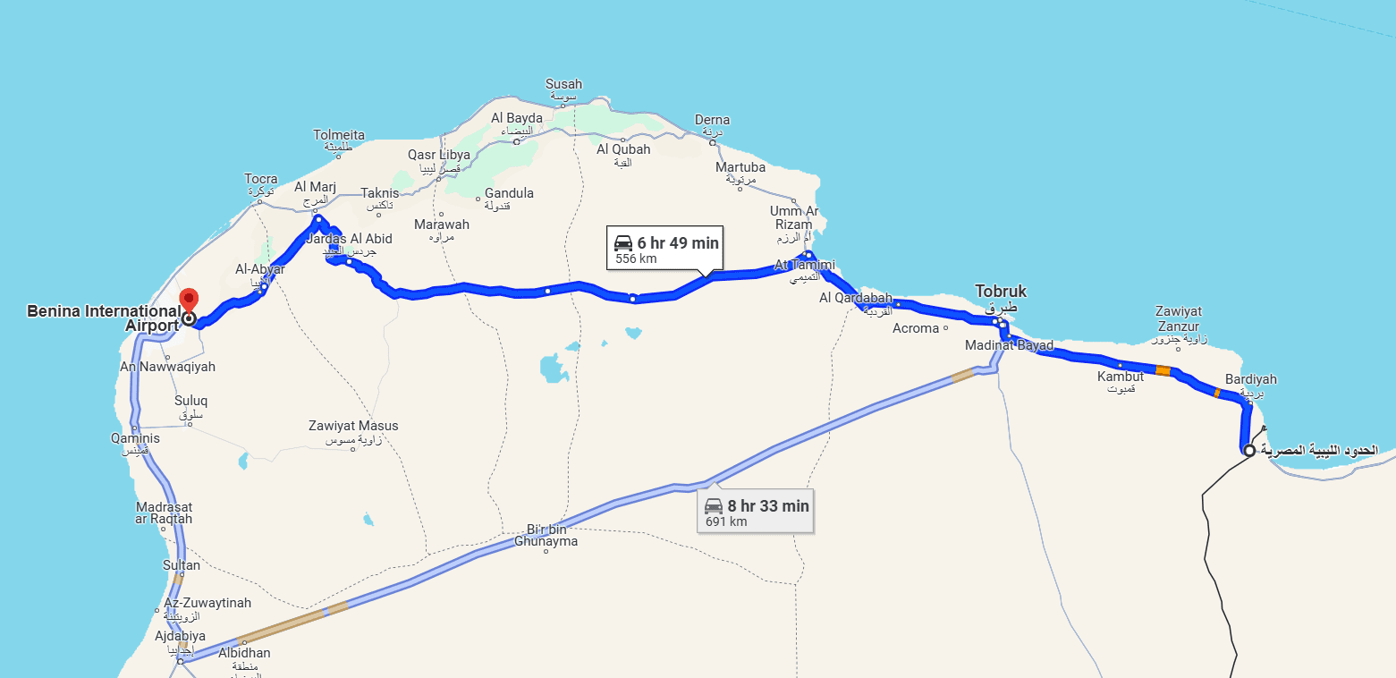 هذا ويبعد مطار بنينا في بنغازي عن أقرب نقطة من الحدود الليبية المصرية بمسافة لا تقل عن 550 كيلومتر. مما ينفي أن يكون المقطع يظهر تجمعًا للقوات الليبية على الحدود مع مصر.