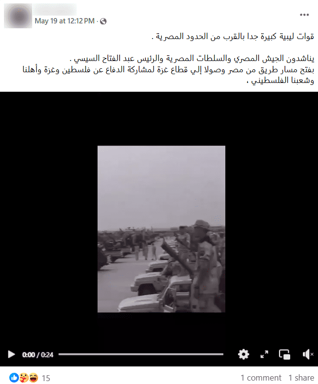 هذا المقطع يعود لاستعراض عسكري في مطار بنينا في ليبيا ولا يظهر تجمع قوات ليبية على الحدود مع مصر