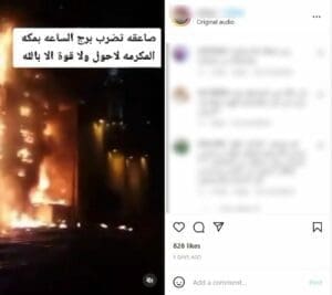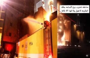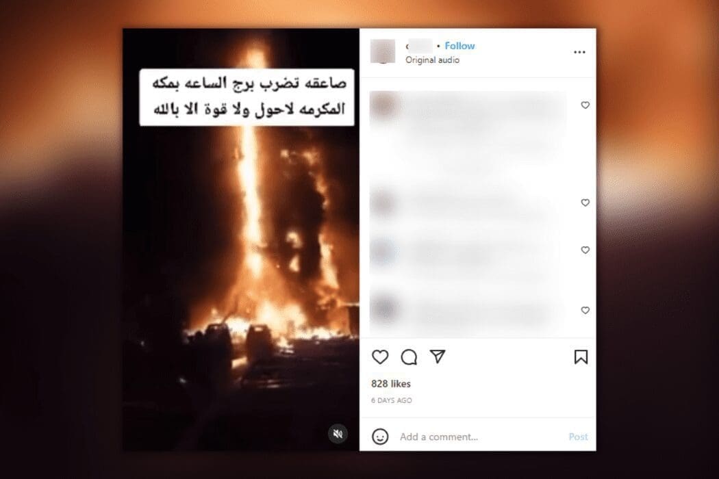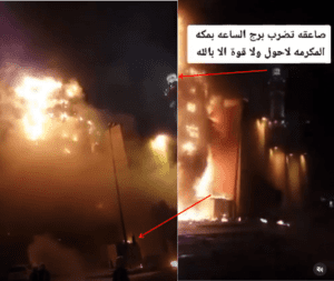 تناقل ناشطون على مواقع التواصل مقطعا يدعون أنه يظهر حريقا ضخما بسبب صاعقةٍ ضربت برج الساعة في مكة مؤخرا،