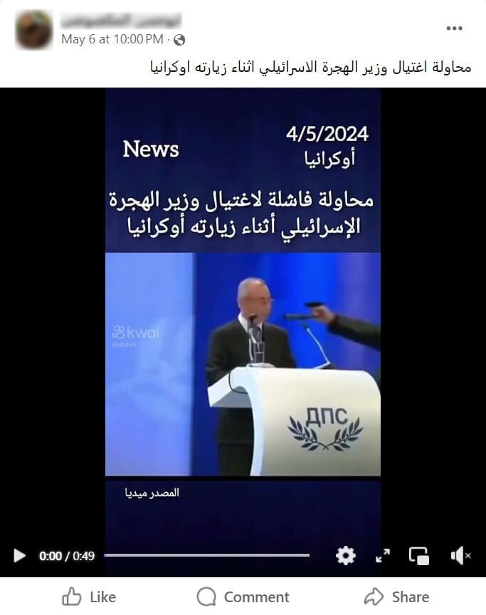 هذا المقطع يعود لمحاولة اغتيال السياسي أحمد دوغان عام 2013 في بلغاريا، وليس لمحاولة اغتيال وزير الهجرة الإسرائيلي في أوكرانيا