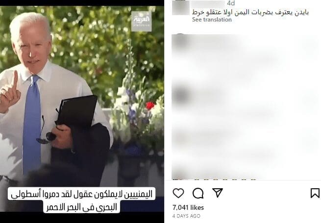 نقلًا عن وكالة بي بي سي -بدون تصرف-: “توعّد عبد الملك الحوثي زعيم جماعة الحوثيين في اليمن الثلاثاء 10 نوفمبر باستهداف السفن الإسرائيلية التي قد تمرّ في البحر الأحمر ردّاً على حرب غزّة.” في أعقاب ذلك، تناقل ناشطون على منصات التواصل مقطعاً يدعون أنه لحديث الرئيس الأمريكي جو بايدن عن مشاركة اليمن في الحرب.