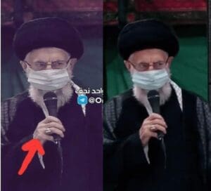 هذه الصورة لخامنئي معدلة، والصورة الأصلية تظهر خامنئي حاملًا مكبر الصوت بيده اليسرى