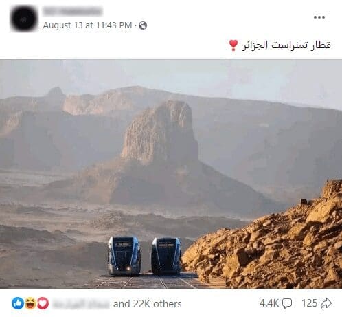 تناقل ناشطون على الفيسبوك صورة يدّعي ناشروها أنها تظهر قطار تمنراست في الجزائر.
