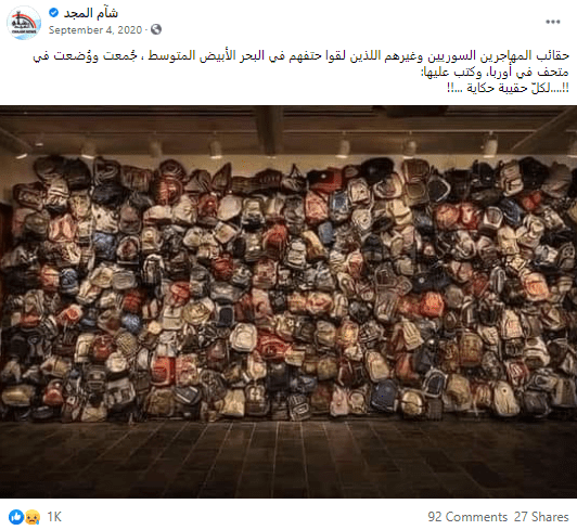 انتشرت على مواقع التواصل الاجتماعي فيسبوك وتويتر صورة يزعم ناشروها أنها تظهر حقائب مهاجرين سوريين الذين لقوا حتفهم في البحر،