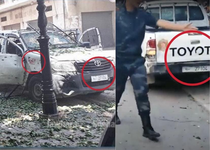 مقارنة بين صورة الادعاء وتظهر نوع السيارة و رقم اللوحة (يسار)، مع لقطة ثابتة من مقطع الفيديو يظهر نوع السيارة ورقم اللوحة نفسه (يمين)