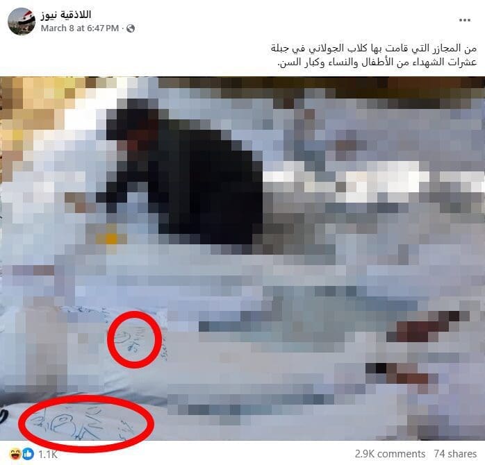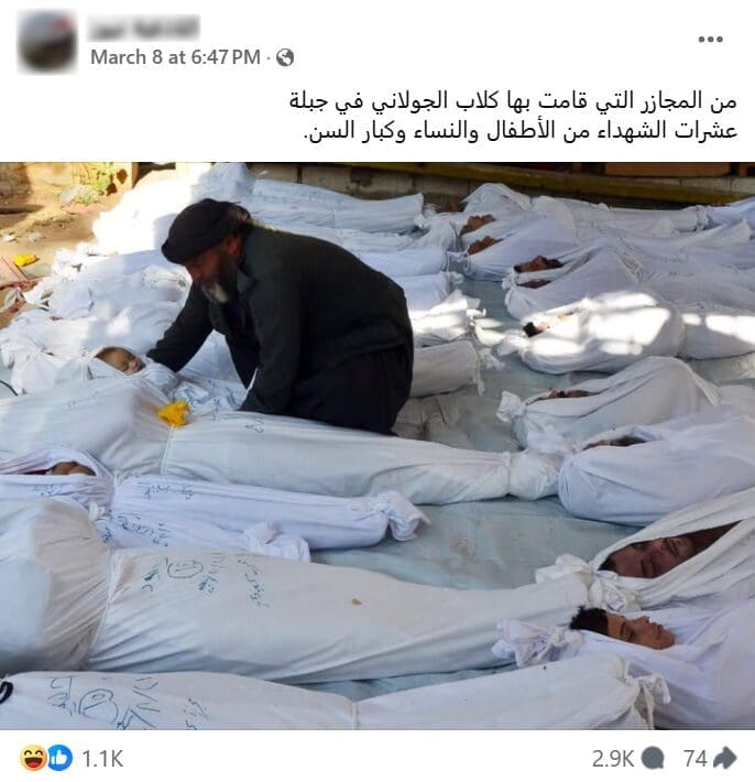 بحسب فرانس24 –دون تصرف-: «أسفرت اشتباكات في مدينة اللاذقية السورية عن سقوط ما لايقل عن 70 قتيلا، بينهم مقاتلون موالون للرئيس المخلوع بشار الأسد وعناصر من قوات الأمن السورية بحسب ما أفاد المرصد السوري لحقوق الإنسان. وأقرت قوات الأمن حظرا للتجول في المدينة، وأرسلت تعزيزات لمحاصرة الموقف. وقالت مراسلة فرانس24 في دمشق دانة البوز إن “اشتباكات عنيفة” ما زالت مستمرة بطرطوس واللاذقية، مؤكدة وصول تعزيزات أمنية للساحل السوري.» إثر ذلك تداول ناشطون على الفيسبوك صورة يدعون أنها تعود لمجزرة قامت بها قوات الأمن السورية.