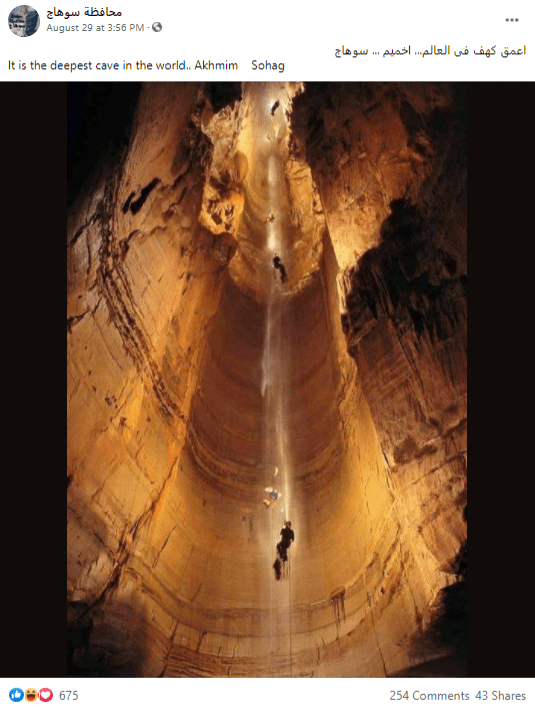 انتشرت على موقع التواصل الاجتماعي فيسبوك صورة يزعم ناشروها أنها تظهر اعمق كهف في العالم في منطقة سوهاج المصرية،