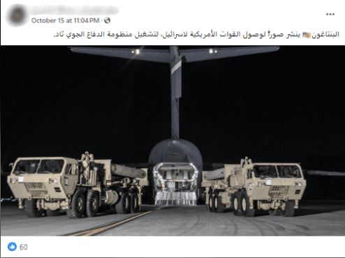 هذه الصورة لا تظهر وصول القوات الأمريكية إلى إسرائيل حديثًا لتشغيل منظومة الدفاع الصاروخي ثاد، بل التقطت في كوريا الجنوبية عام 2017