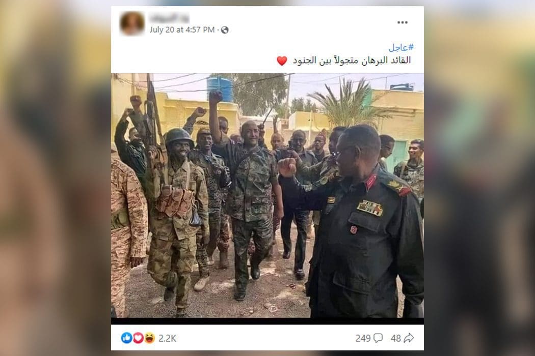 تناقل ناشطون على الفيسبوك صورة يدّعي ناشروها أنها تظهر قائد الجيش السوداني الفريق أول عبد الفتاح البرهان متجولًا بين الجنود في أحد الأحياء في السودان مؤخرًا.