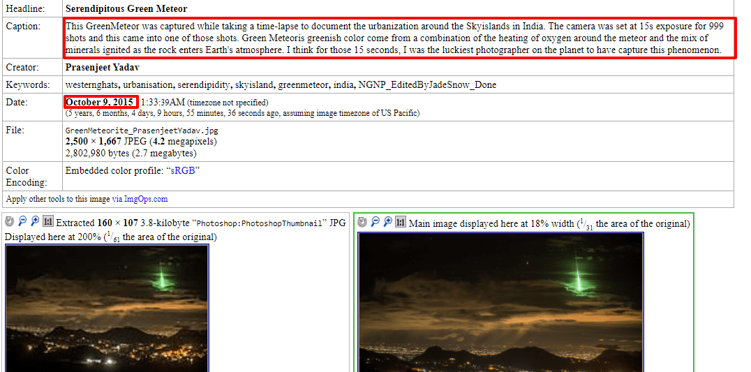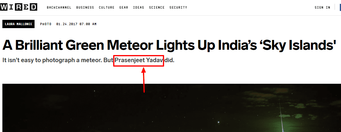 جاء في المقال أن الصورة التقطها المصور “براسينجيت ياداف” عندما سقط النيزك الأخضر فوق ميتوبالايام وهي بلدة صغيرة في منطقة غاتس الجبلية في جنوب الهند،