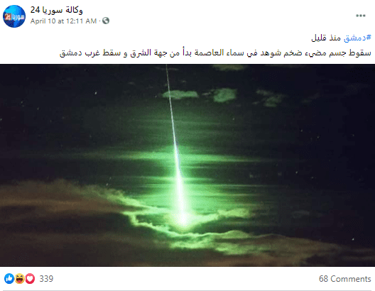 انتشرت على مواقع التواصل الاجتماعي فيسبوك وتويتر صورة يزعم ناشروها أنها التقطت في مدينة دمشق السورية لسقوط نيزك،