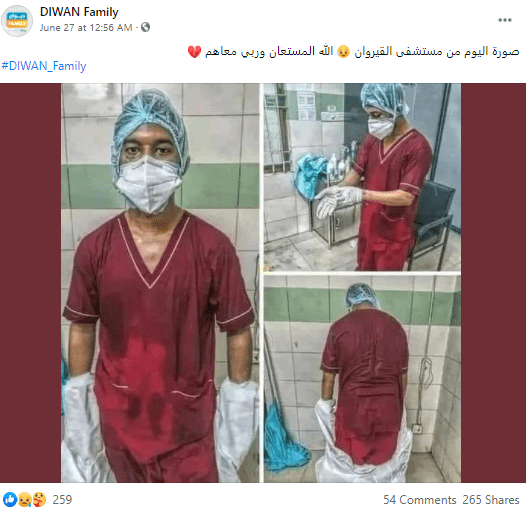 انتشرت على مواقع التواصل الاجتماعي صورة يزعم ناشروها أنها تعود لطبيب بملابس مبللة في القيروان – تونس،