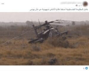 هذه الصورة متداولة منذ عام 2015 لهبوط طائرة أباتشي سعودية في منذ الطوال، ولا تظهر إسقاط طائرة أباتشي إسرائيلية