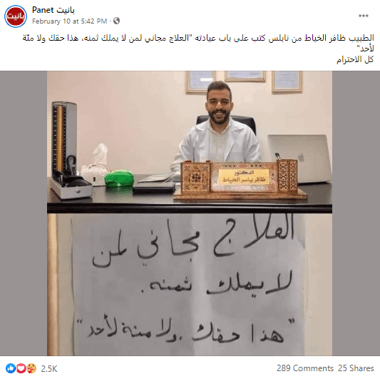الطبيب ظافر الخياط من نابلس كتب على باب عيادته “العلاج مجاني لمن لا يملك ثمنه، هذا حقك ولا منّة لأحد”