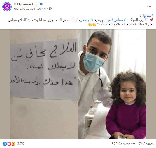 انتشرت على مواقع التواصل الاجتماعي فيسبوك وتويتر صورة طبيب ولافتة مكتوب عليها “العلاج مجاني لمن لا يملك ثمنه” وادعى ناشرو الصورة بأنها تعود لطبيب يدعى حسام ظافر من الجزائر،