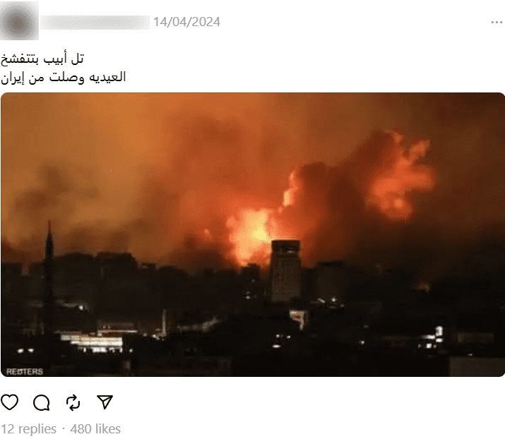 نشرت إحدى حسابات ثريدز الادعاء بتاريخ 14 أبريل 2024، محققاً 480 تفاعل،