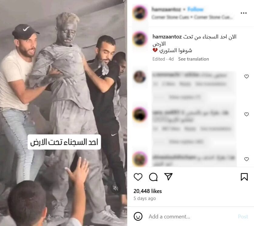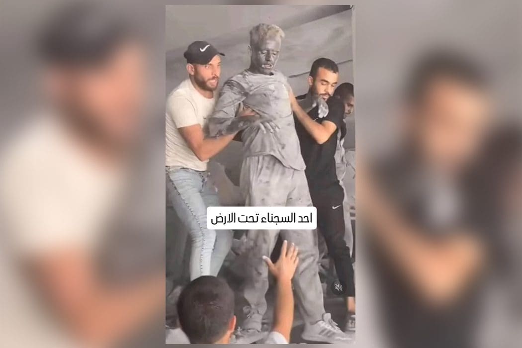 هذه الصورة مقتبسة من مقطع فيديو لناجٍ جراء قصف مبنى سكني في غزة، وليست لتحرير سجين من سجن صيدنايا مؤخرًا