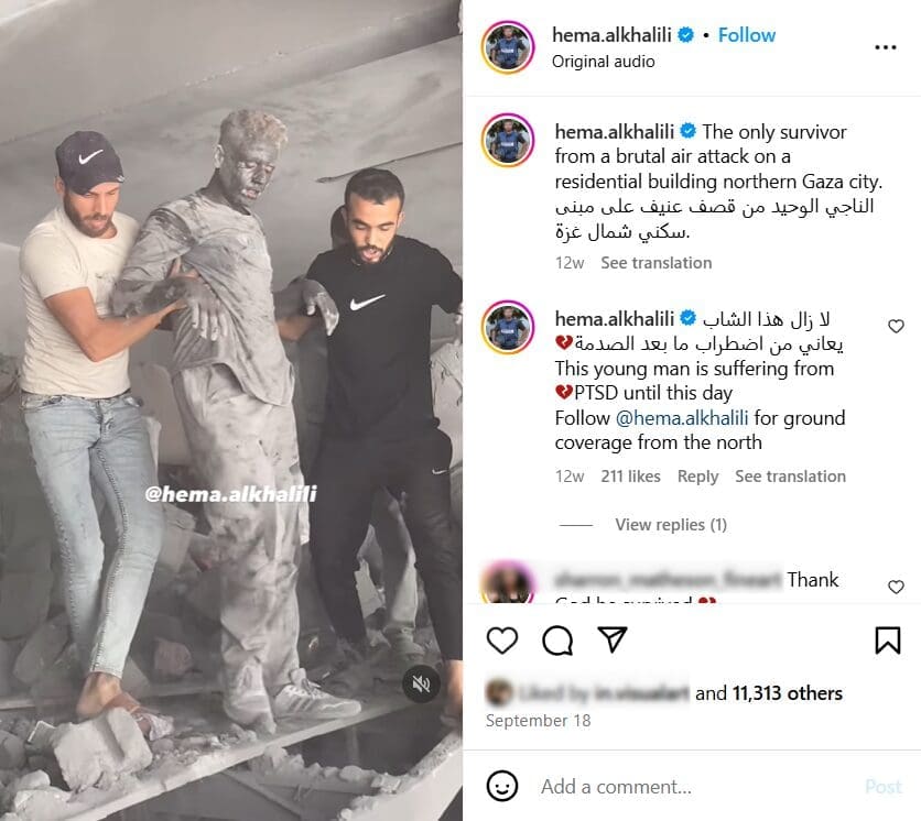 حيث تبين أن الصورة مقتبسة من مقطع نشره المصور عبر حسابه على المنصة بتاريخ 18 سبتمبر 2024، وأرفق في الوصف أنه يبين الناجي الوحيد من قصف عنيف على مبنى سكني شمال غزة.