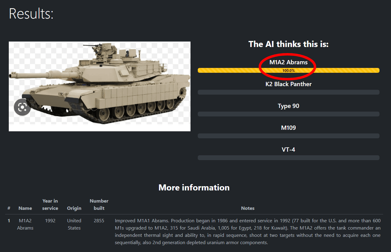 بالمقابل، وبالاستعانة بموقع “faktisk” لتصنيف الدبابات وعربات المدفعية بالاعتماد على الذكاء الاصطناعي، خلصت النتيجة إلى أن الدبابة في صورة الادعاء